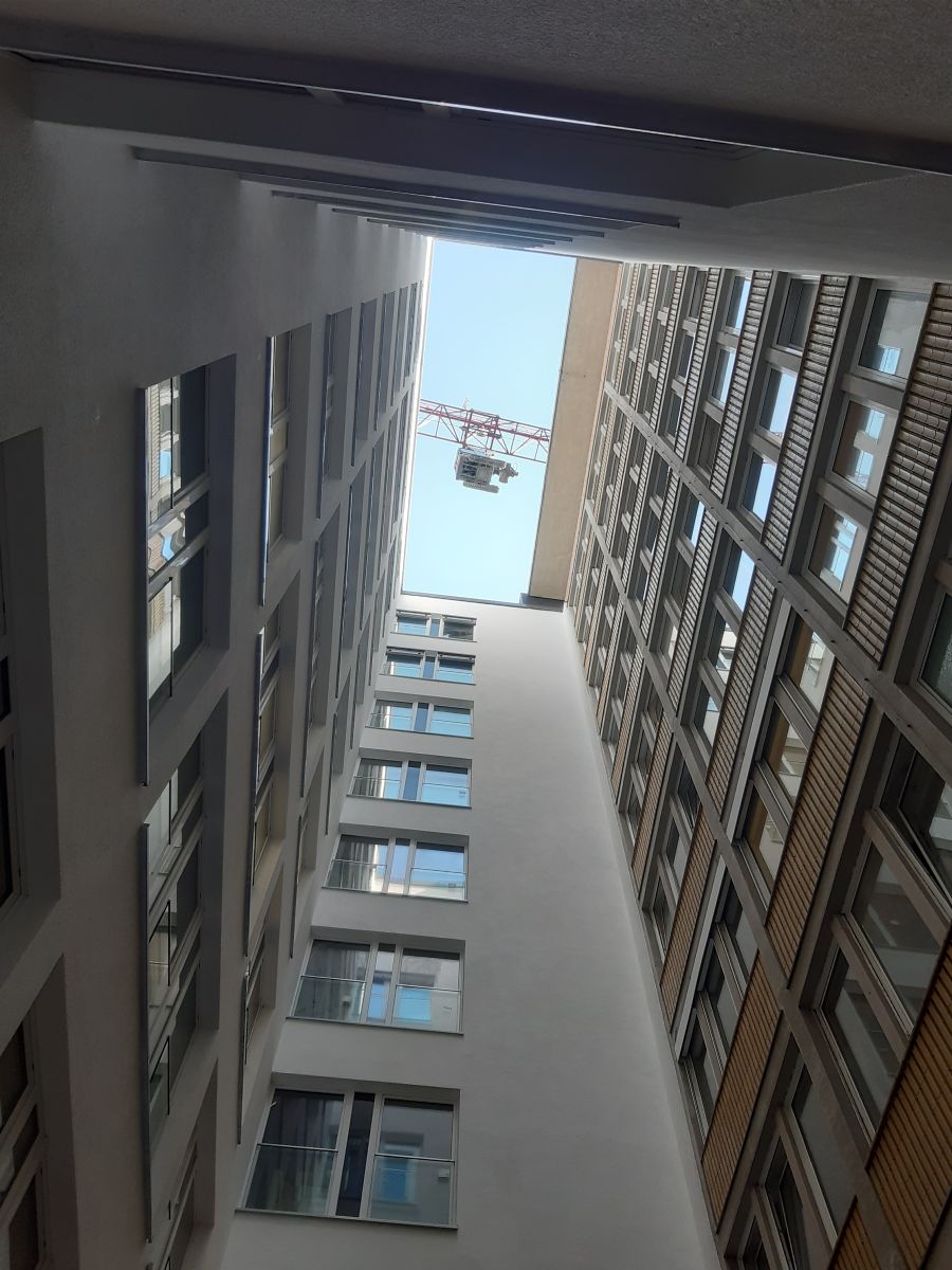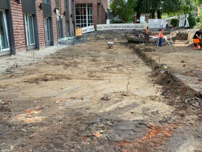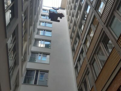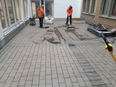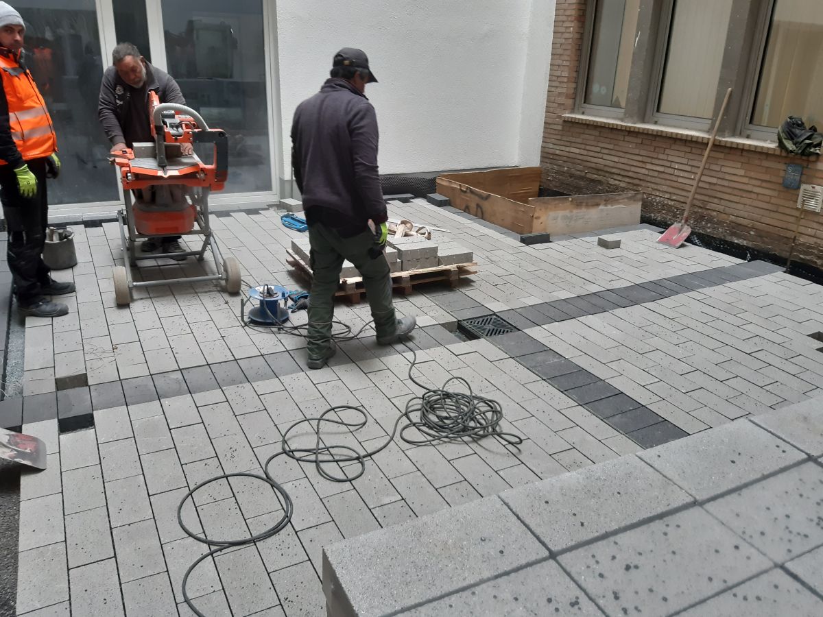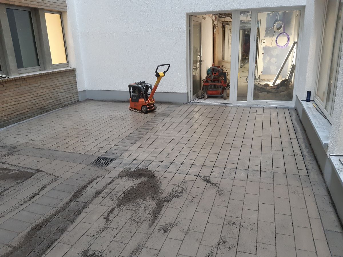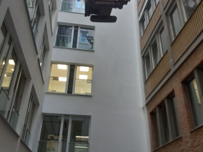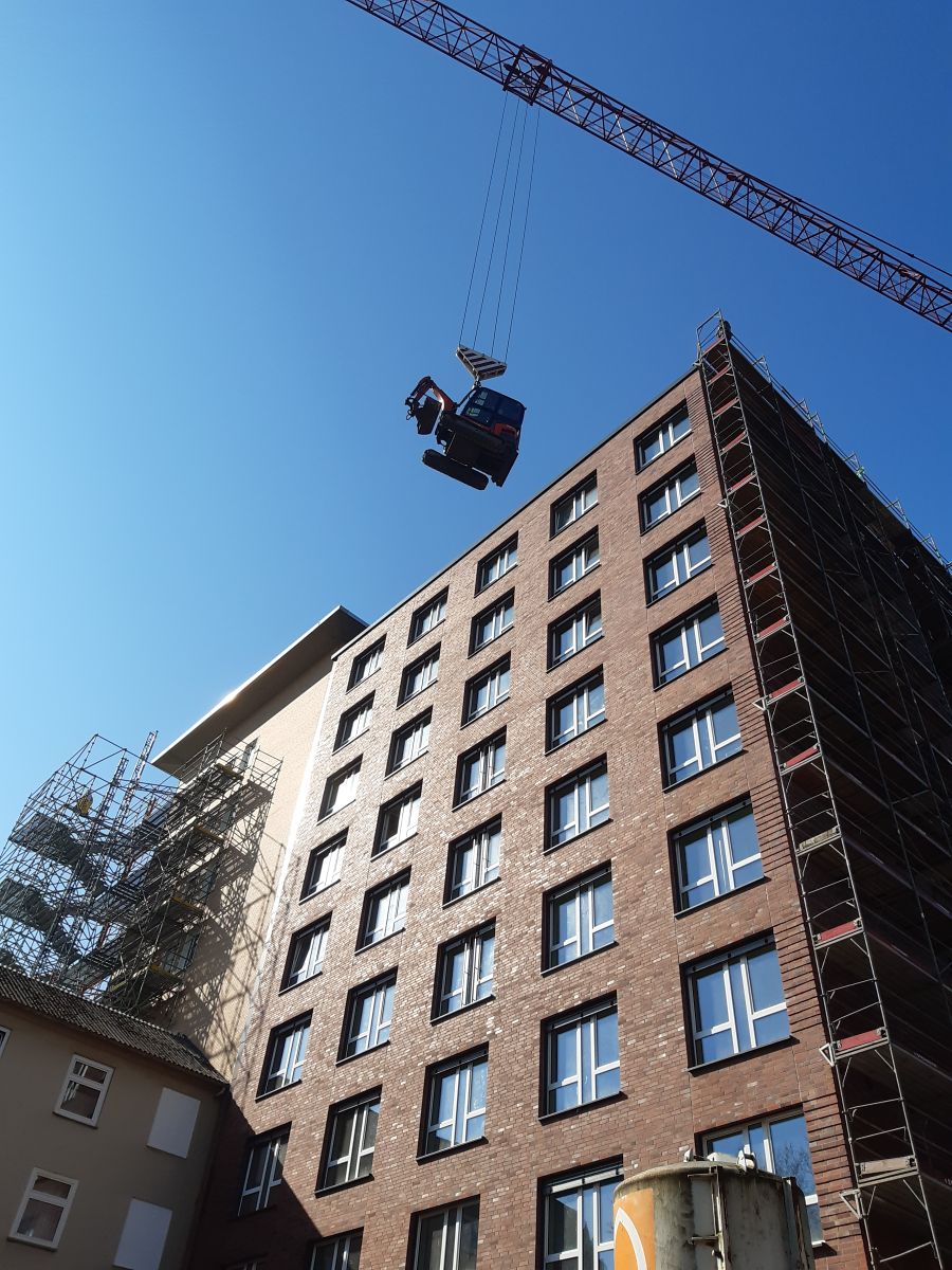 Arbeiten im Innenhof, hierzu wurde ein Minibagger mit Kran in den Innenhof gehoben.