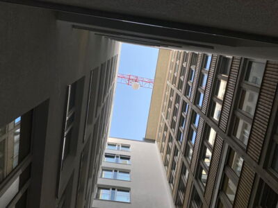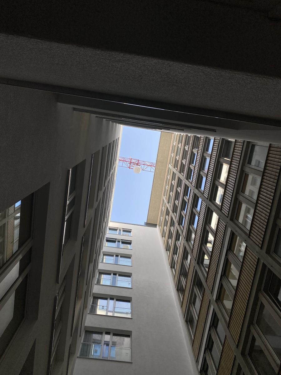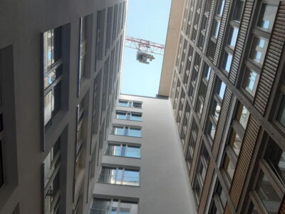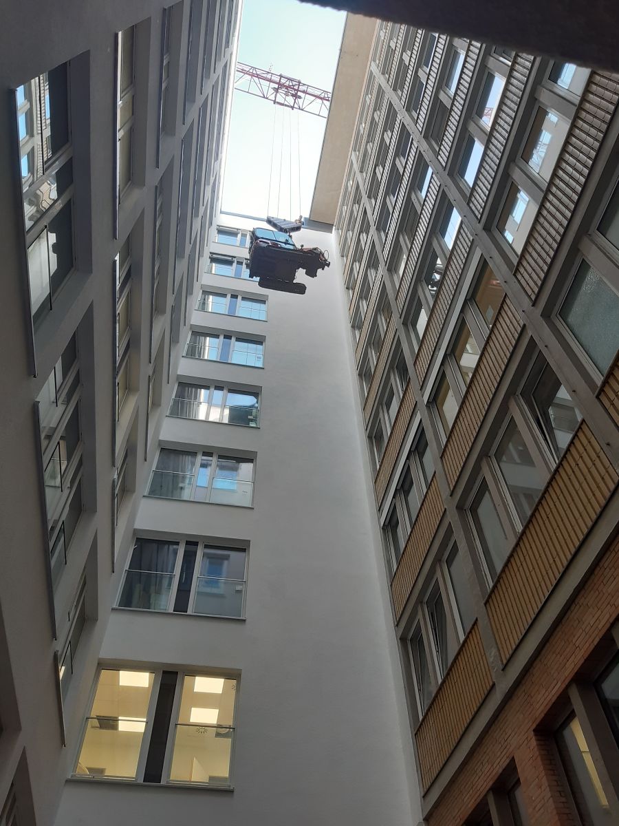 Arbeiten im Innenhof, hierzu wurde ein Minibagger mit Kran in den Innenhof gehoben.